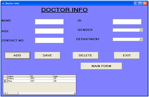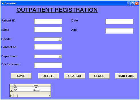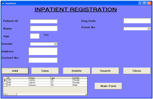 - Patient module: It keeps track of all details about both in-patient and out-patient. Patient id, patient name, address, admitted date, doctor name, and room no are entered in a form and stored for future reference. Also particular patient details can be viewed in the table using a separate form with an attribute patient id.